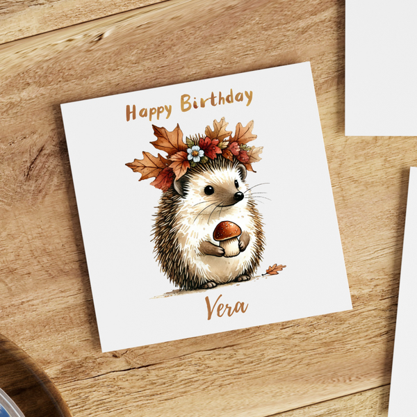 Hedgehog Card with an Autumn theme, personalised with your choice of name.Printed on 300gsm recycled matte cardstock, measures 5.5 x 5.5 inches adn comes supplied with a kraft envelope.