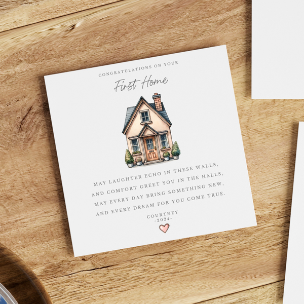 Frist Home Card, Printed on white 300gsm recycled matte cardstock and measures 5.5 x 5.5 inches, supplied with a kraft envelope.Personalise with a name.